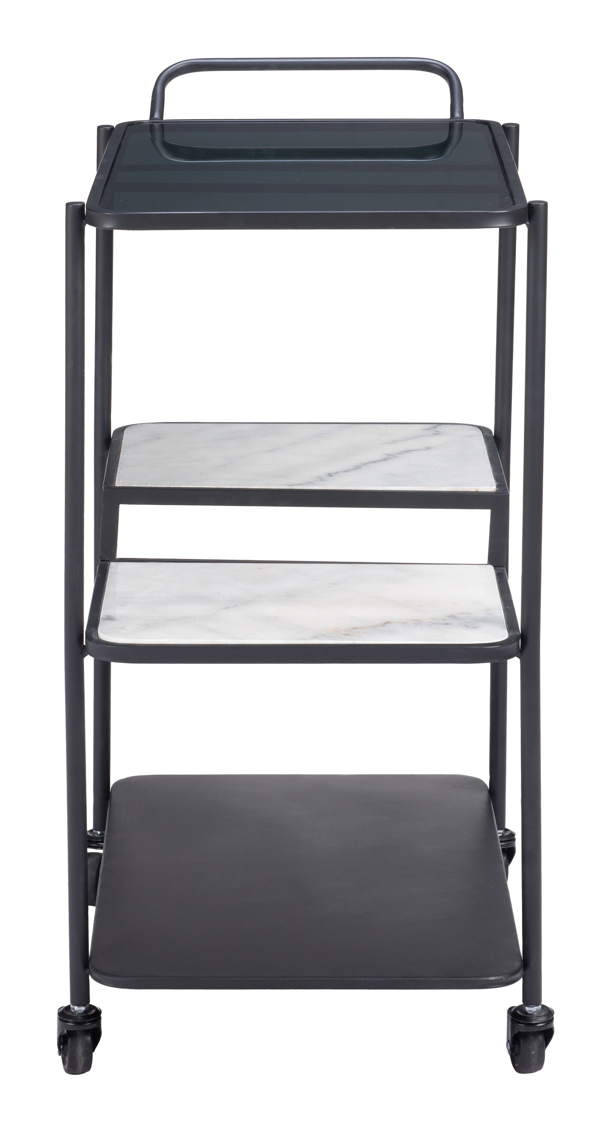 Constanza Black Bar Cart with Glass Shelves and Marble Accents